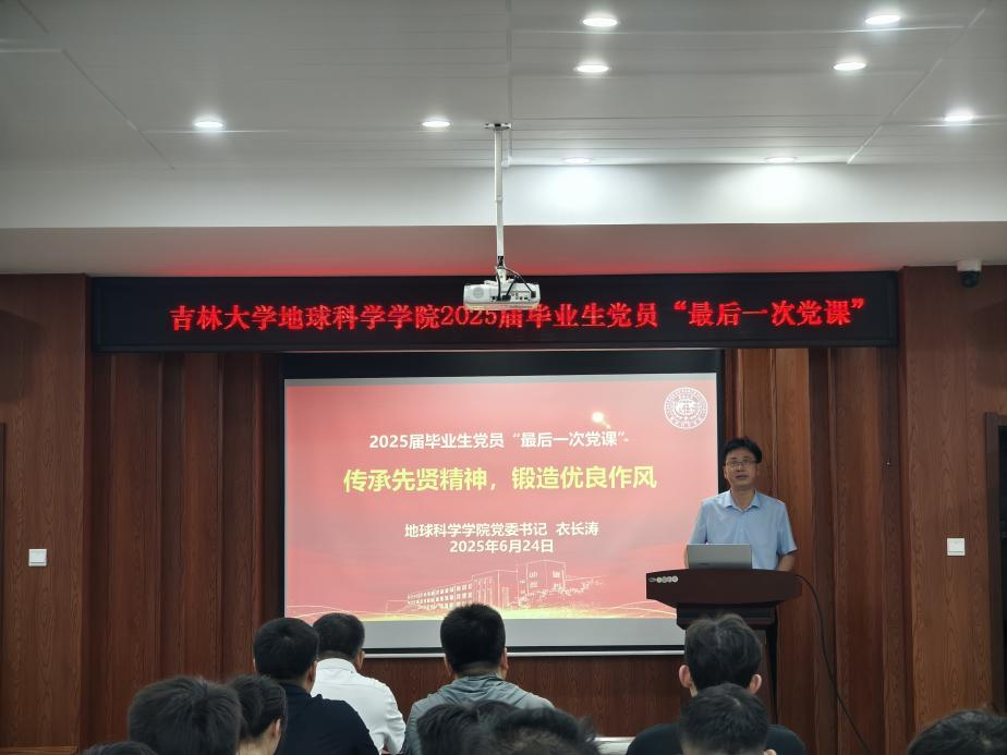 党委书记衣长涛在鸽子楼报告厅为全体2025届毕业生党员讲授“最后一次党课”,会议由欧洲杯党委副书记吴新明主持,欧洲杯2025届毕业生全体党员参加会议。