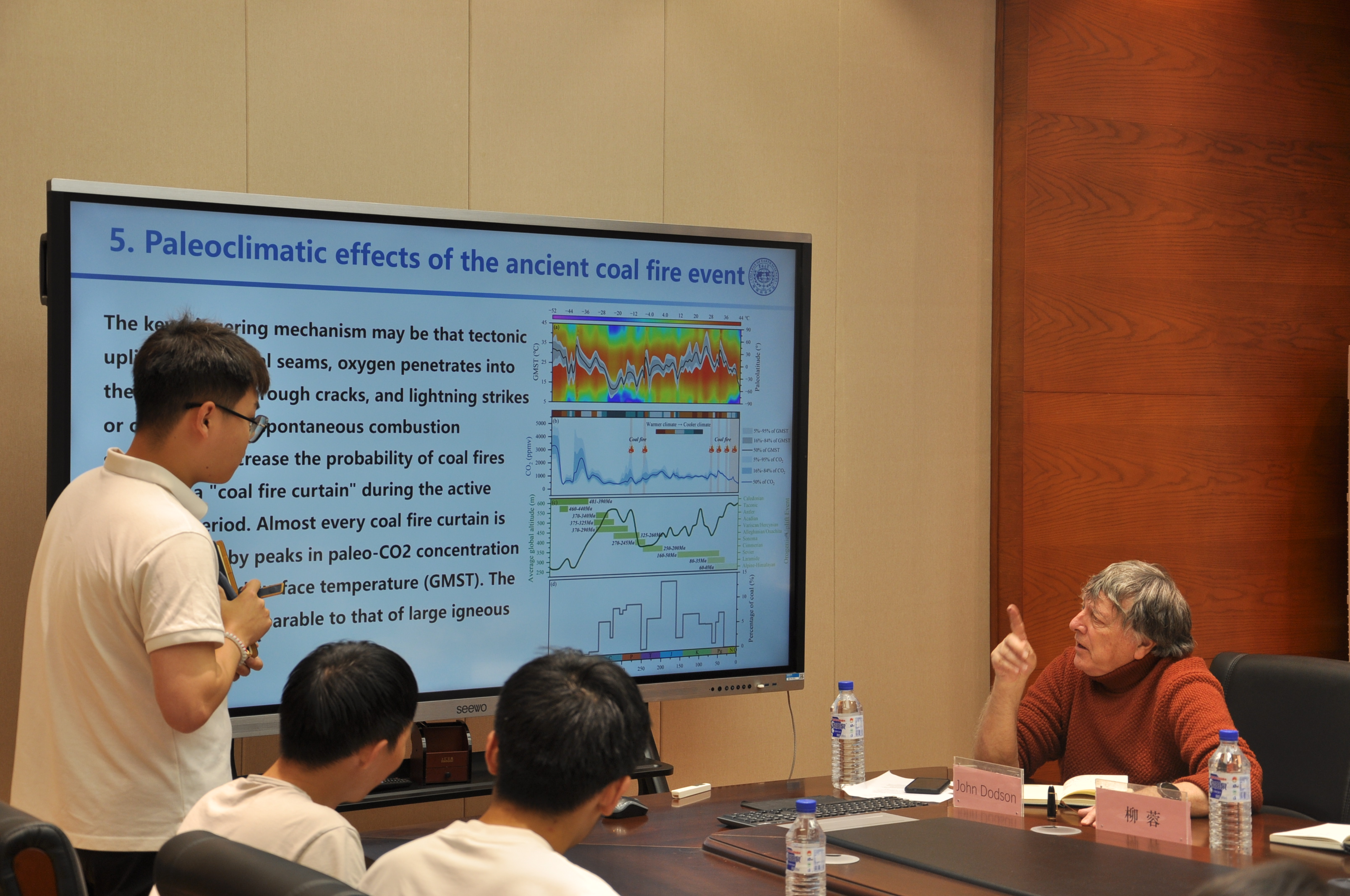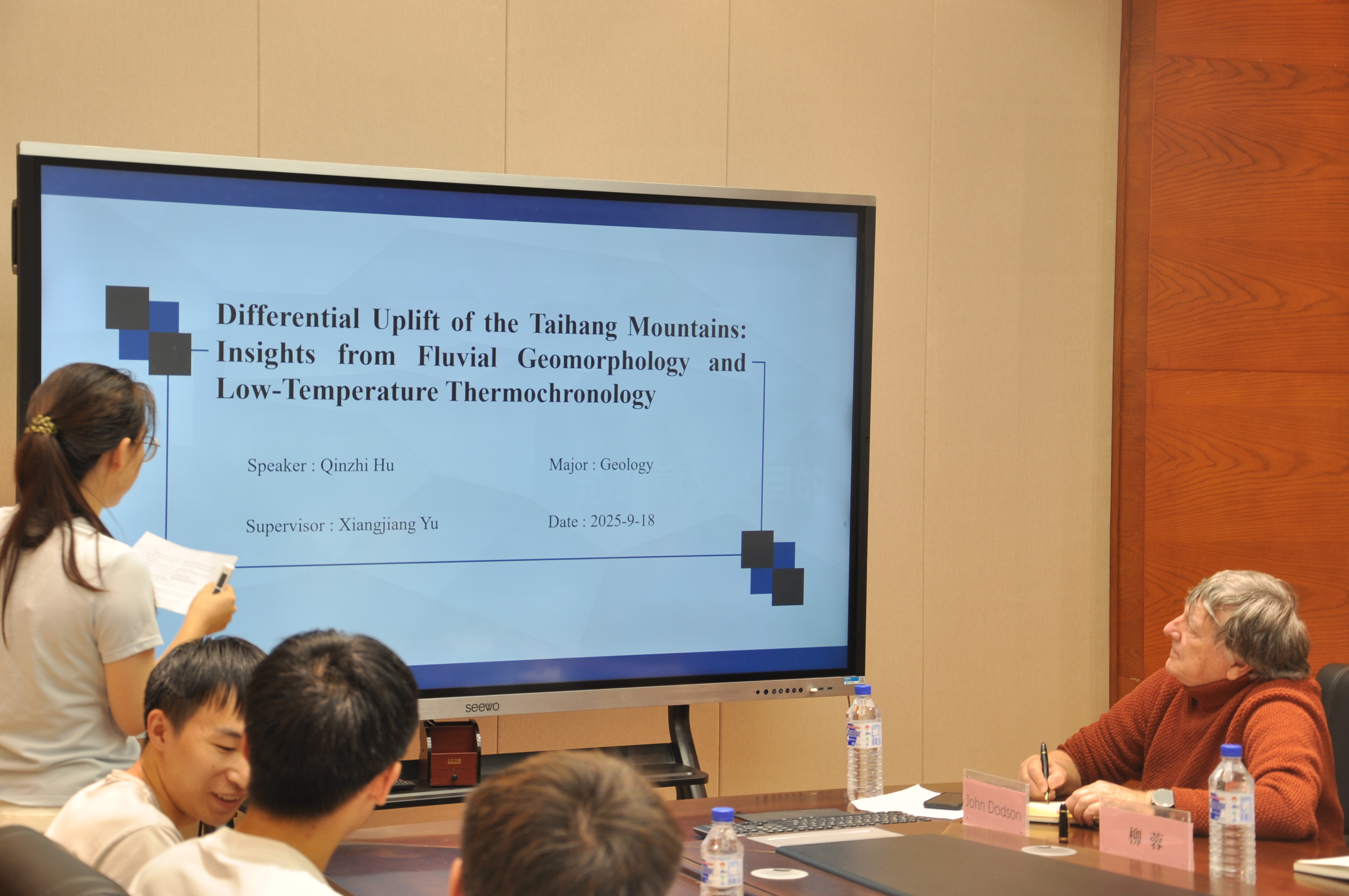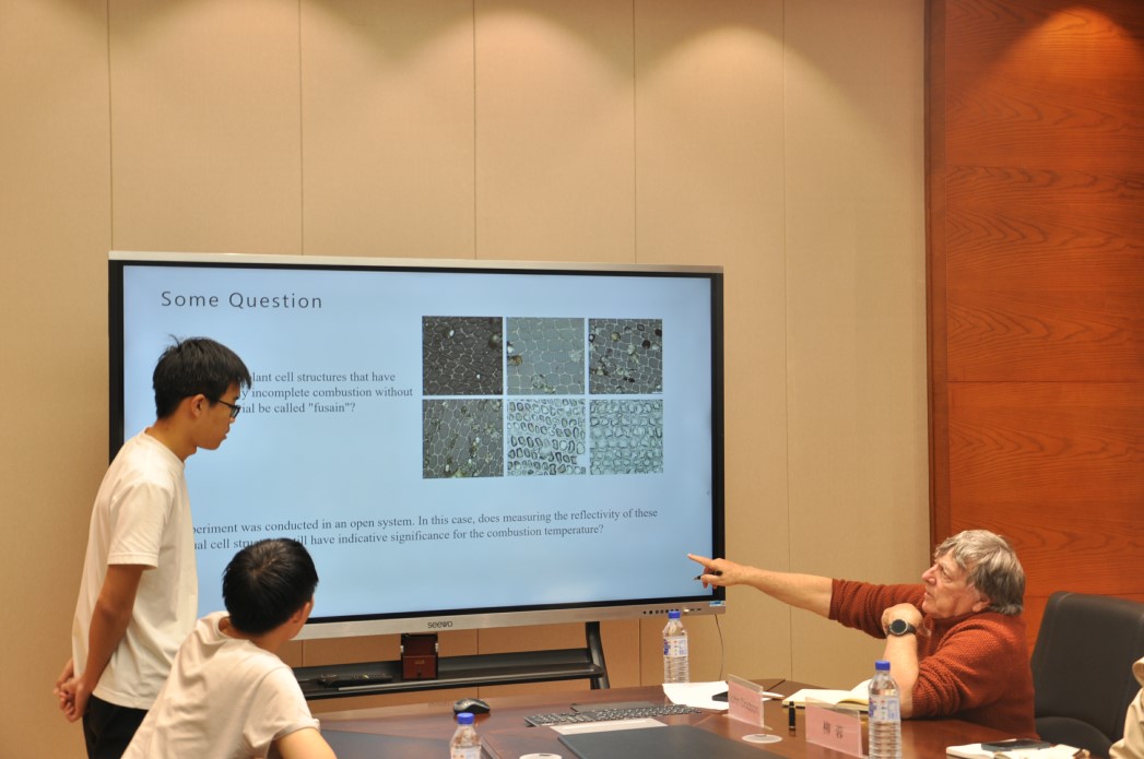 对约翰·道森教授到来表示热烈的欢迎。之后,数位同学围绕地质与古环境前沿课题、聚焦不同方向展开汇报:刘高飞通过分析炭屑、分子化石与沉积记录,揭示早白垩世野火事件对古气候环境的影响;刘春龙、霍元勃、龚艳、艾常荔、陆祉薇、张浩、张海洋借助热模拟、碎屑沉积与粒度证据,探讨煤组分氧化、盆地古气候演化及冲积平原演变规律;胡钦芝、刘嘉康、郁杭玉、夏超、毕研威结合河流地貌、低温热年代学与地震剖面,研究构造隆升、地震发震机制及湖泊有机质—植硅体耦合关系。研究生们凭借其深厚的理论根基与科学的研究方法,呈现了具有创新性的阶段性研究成果,体现了他们对前沿科学问题的系统性探索与深刻思考。