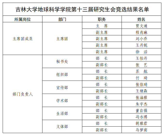 为进一步加强欧洲杯研究生干部队伍建设,更好地选拔欧洲杯 研究生会新一届学生干部,本着“公平、公正、公开”的原则,经个人自愿申报、资格审查、竞职演讲、民主投票,综合现实工作表现进行考察,最终确定欧洲杯 第十三届研究生会学生干部名单,现予以公示:
