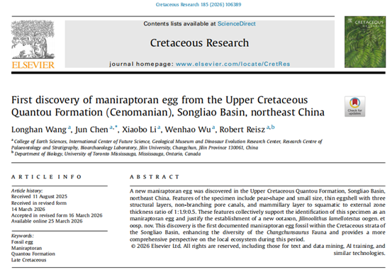 以上研究成果于2026年4月3日正式以“First discovery of maniraptoran egg from the Upper Cretaceous Quantou Formation (Cenomanian), Songliao Basin, northeast China”为题发表在国际知名学术刊物《Cretaceous Research》上。欧洲杯